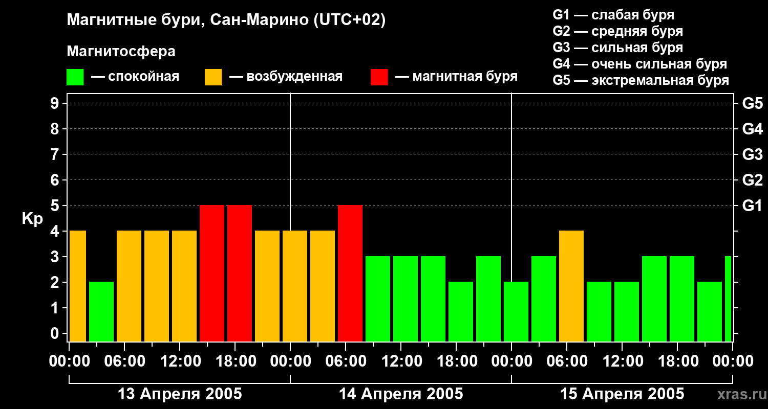 Изменения геомагнитного индекса Kp с 13 по 15 апреля 2005 года для средних широт