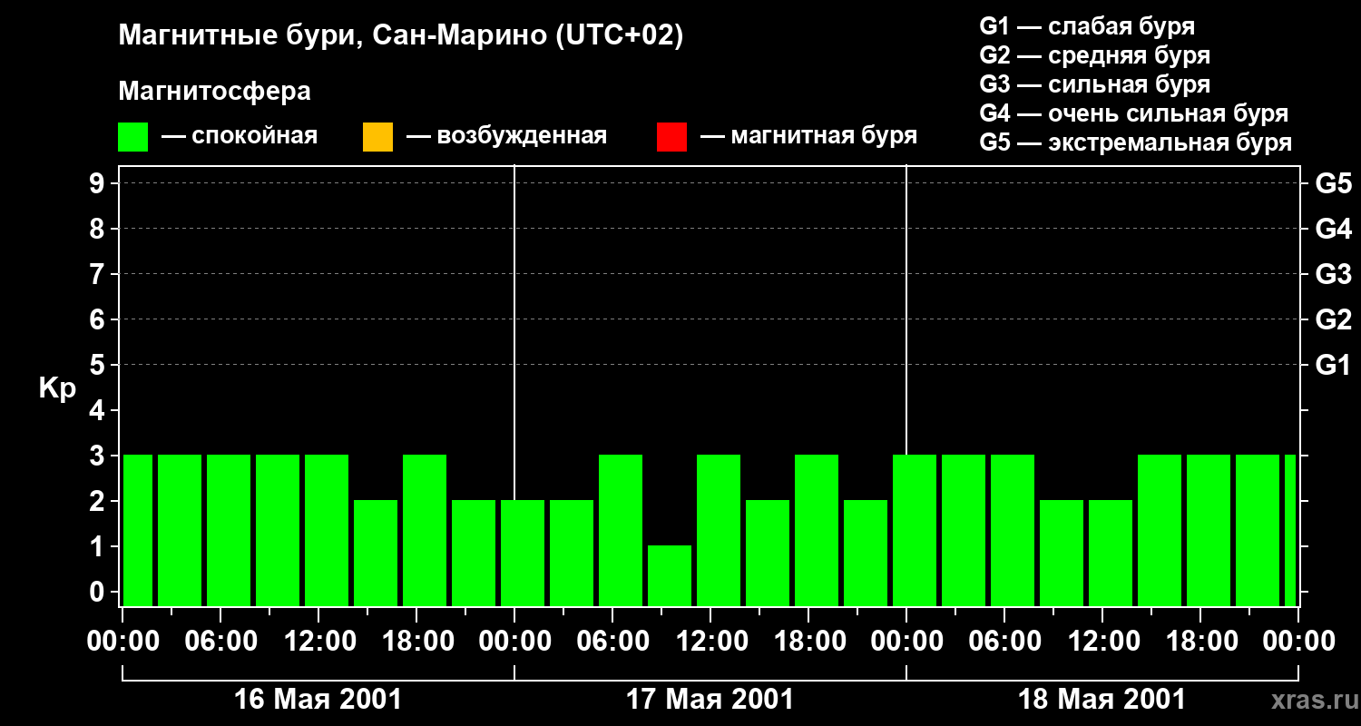 Изменения геомагнитного индекса Kp с 16 по 18 мая 2001 года для средних широт