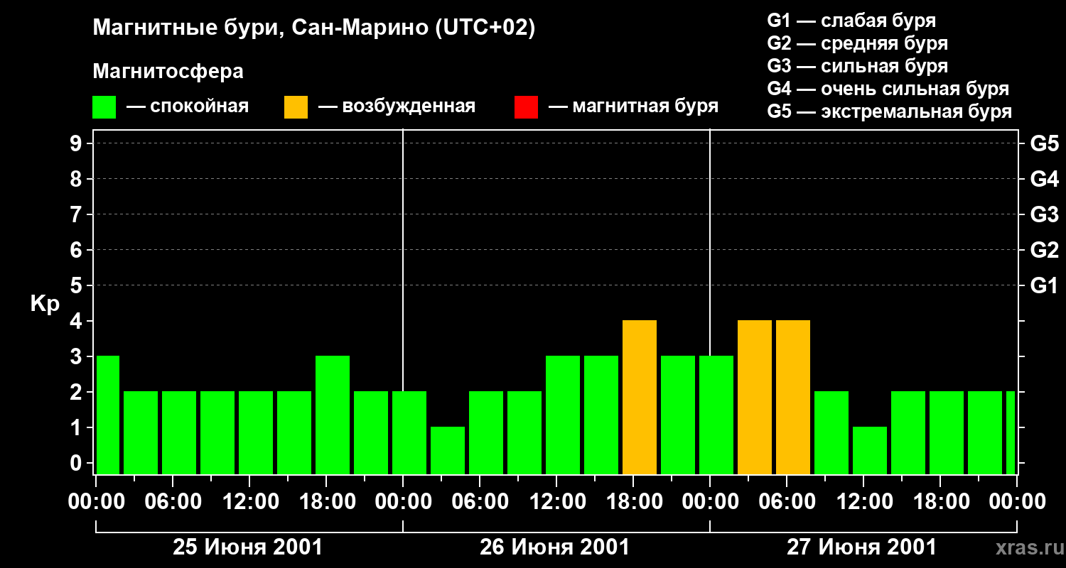 Изменения геомагнитного индекса Kp с 25 по 27 июня 2001 года для средних широт