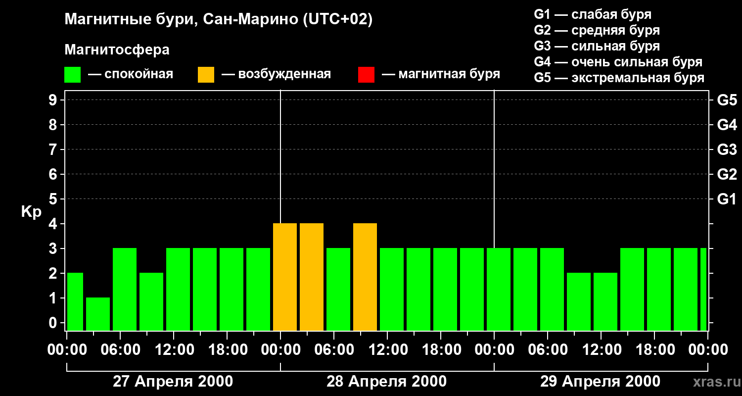 Изменения геомагнитного индекса Kp с 27 по 29 апреля 2000 года для средних широт