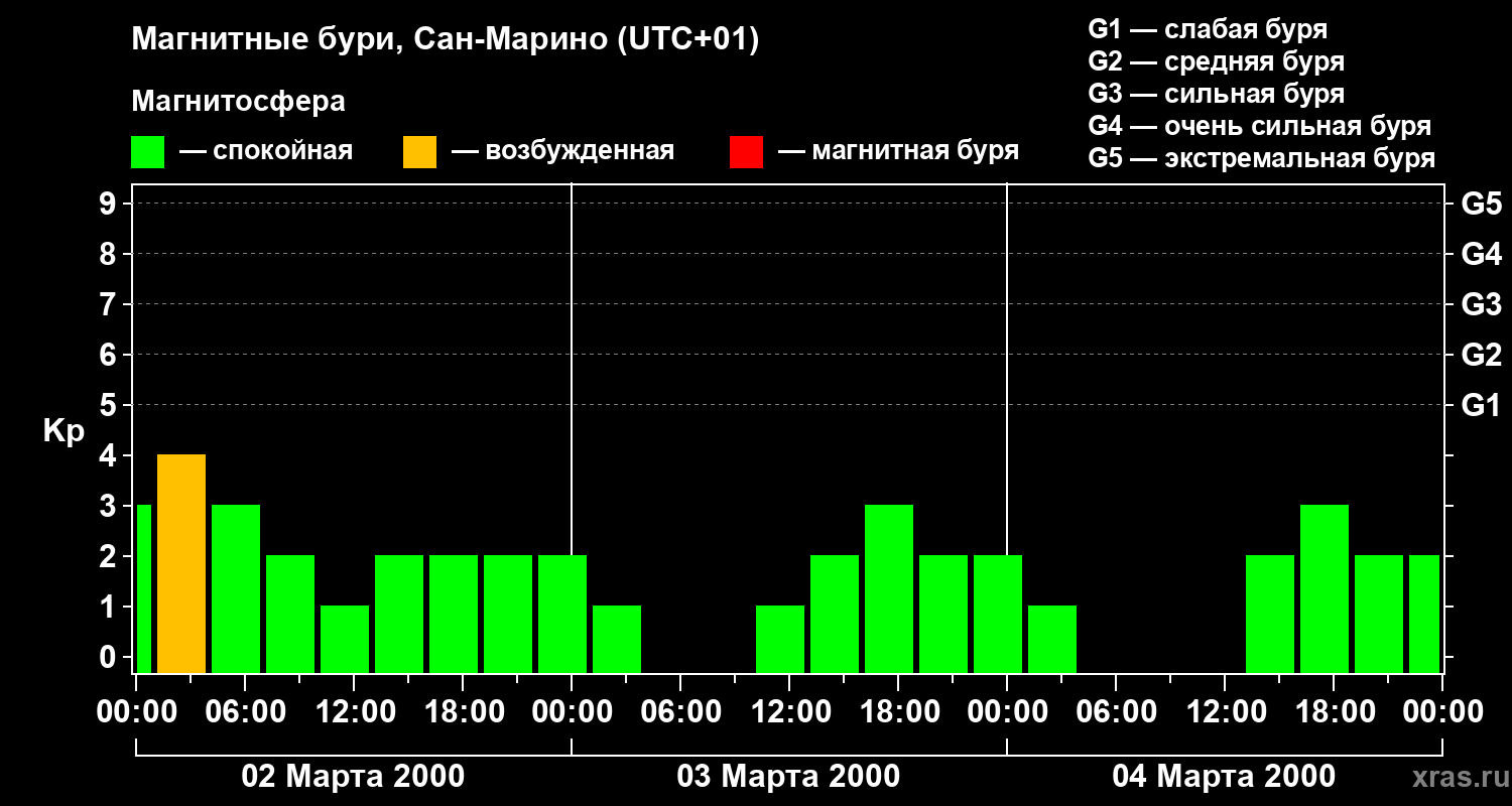 Изменения геомагнитного индекса Kp с 2 по 4 марта 2000 года для средних широт