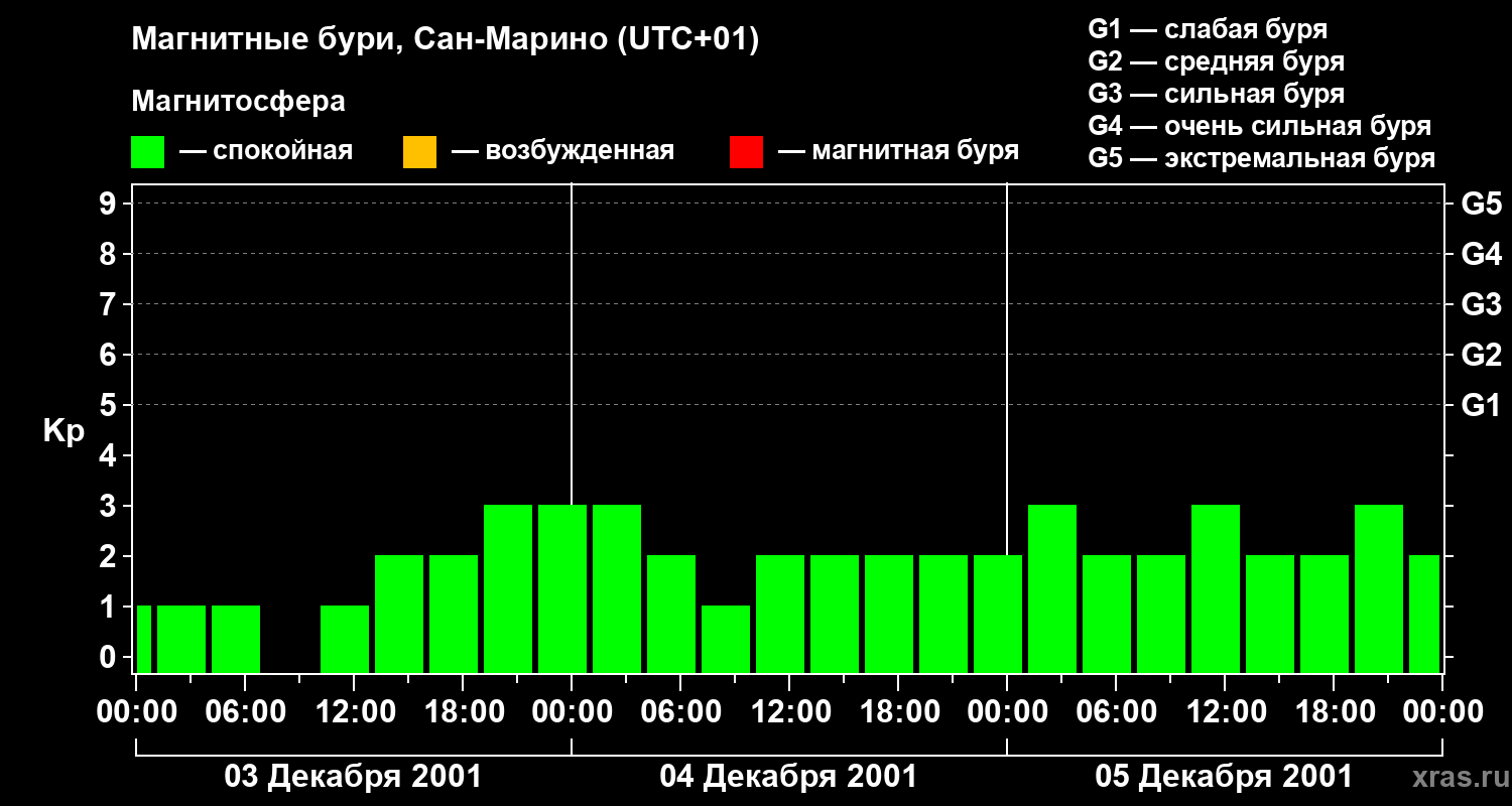 Изменения геомагнитного индекса Kp с 3 по 5 декабря 2001 года для средних широт