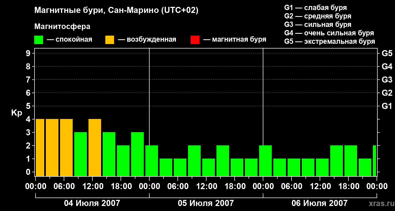 Изменения геомагнитного индекса Kp с 4 по 6 июля 2007 года для средних широт
