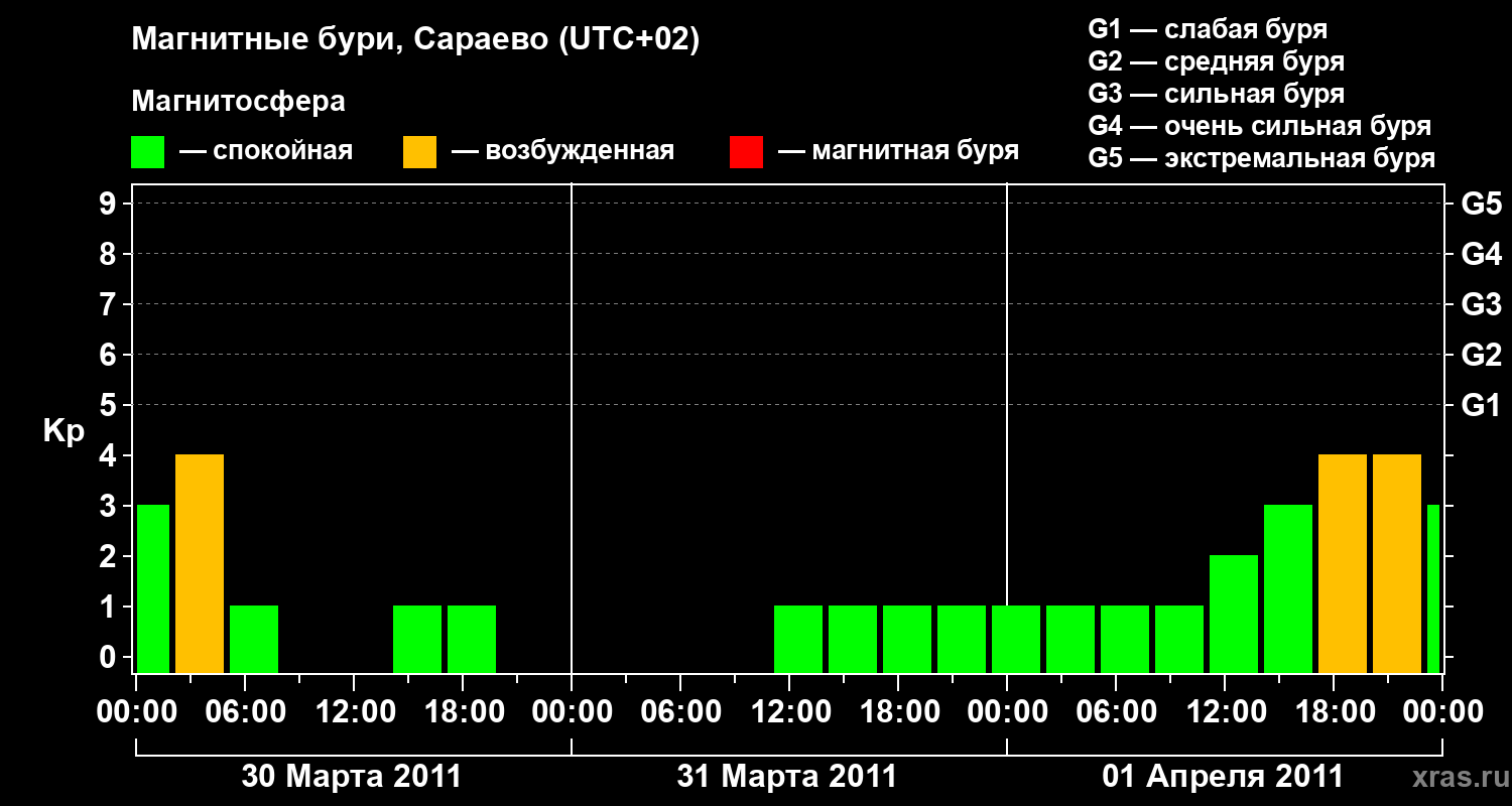 Изменения геомагнитного индекса Kp с 30 марта по 1 апреля 2011 года для средних широт