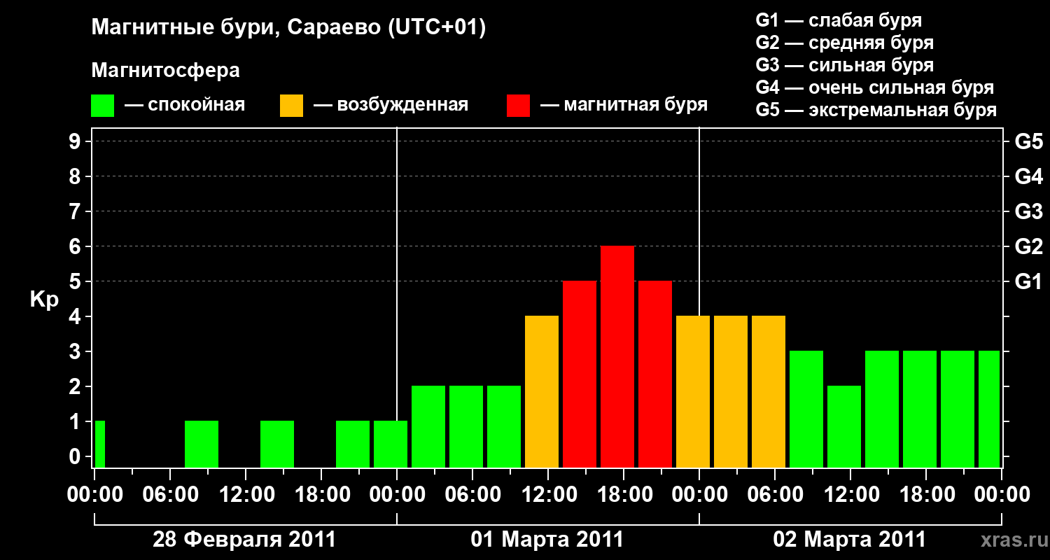 Изменения геомагнитного индекса Kp с 28 февраля по 2 марта 2011 года для средних широт