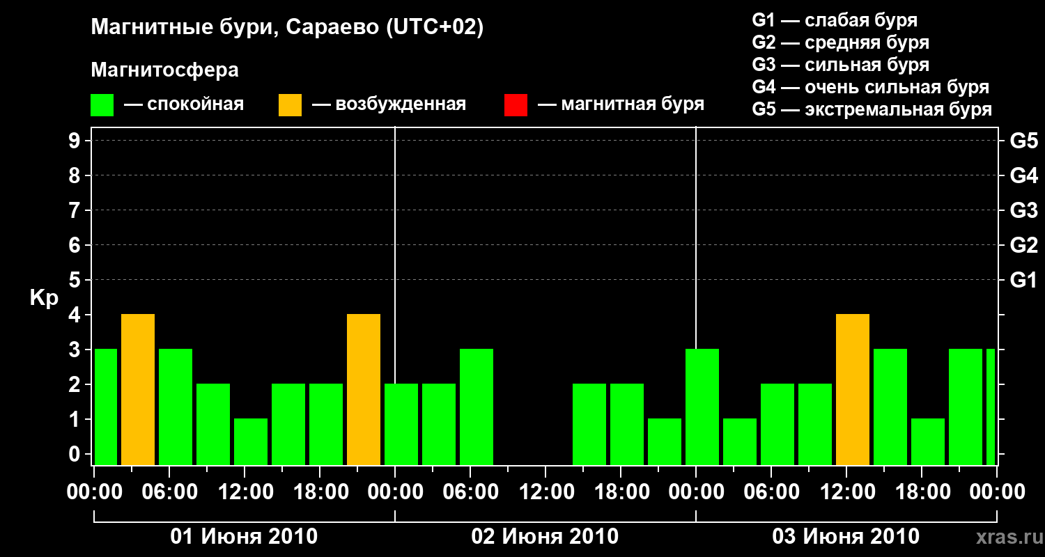 Изменения геомагнитного индекса Kp с 1 по 3 июня 2010 года для средних широт
