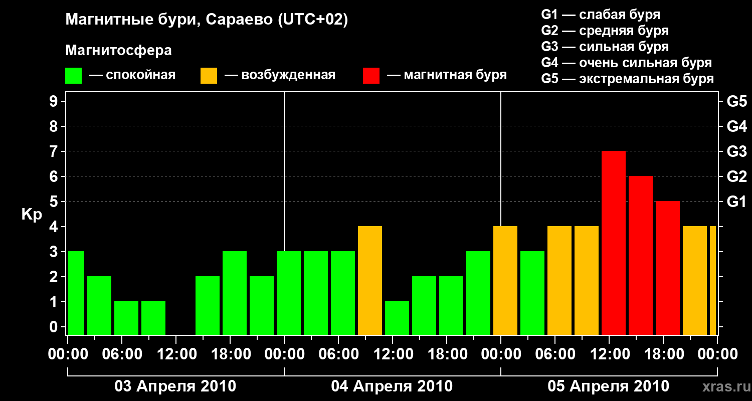 Изменения геомагнитного индекса Kp с 3 по 5 апреля 2010 года для средних широт