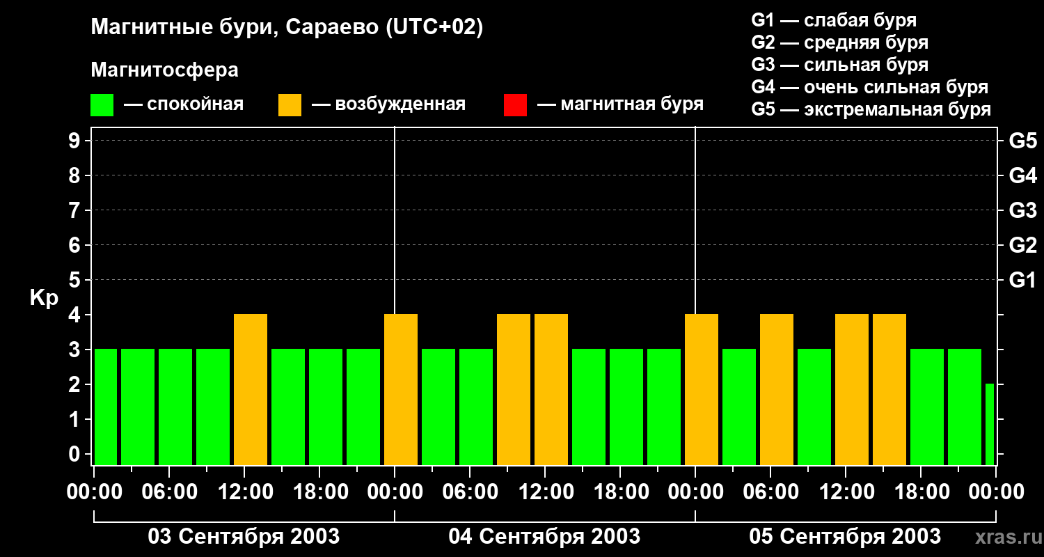 Изменения геомагнитного индекса Kp с 3 по 5 сентября 2003 года для средних широт