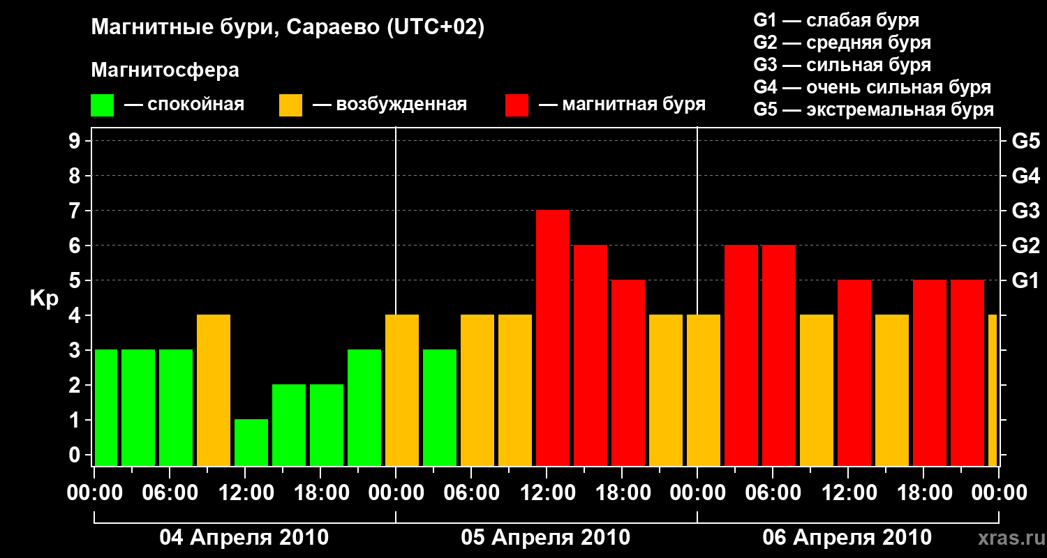 Изменения геомагнитного индекса Kp с 4 по 6 апреля 2010 года для средних широт