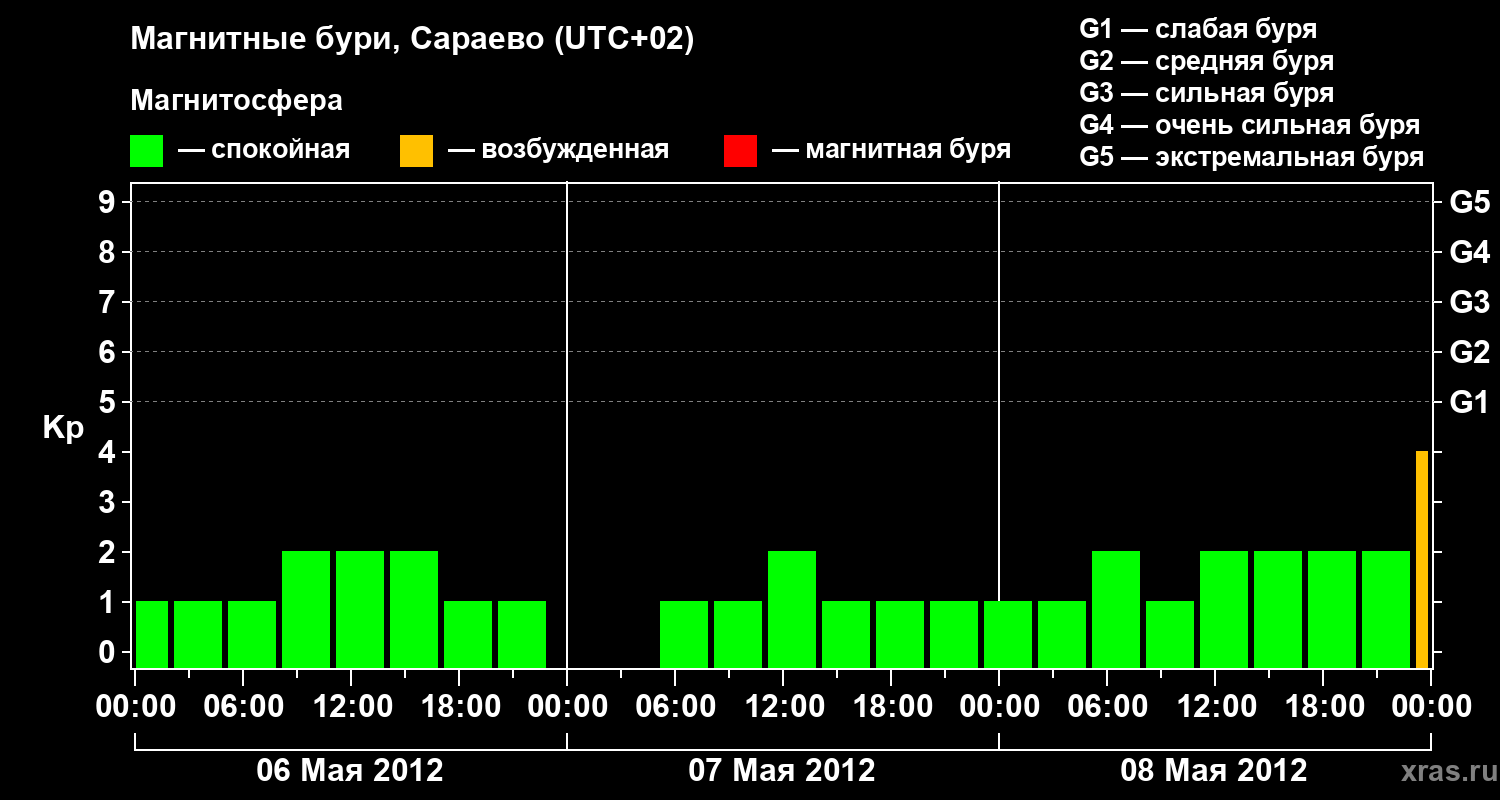 Изменения геомагнитного индекса Kp с 6 по 8 мая 2012 года для средних широт