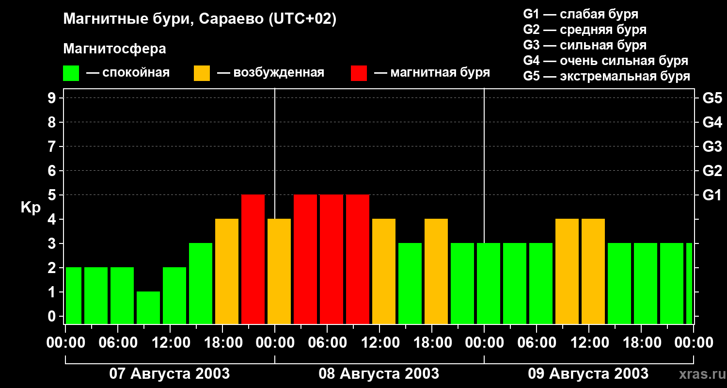 Изменения геомагнитного индекса Kp с 7 по 9 августа 2003 года для средних широт