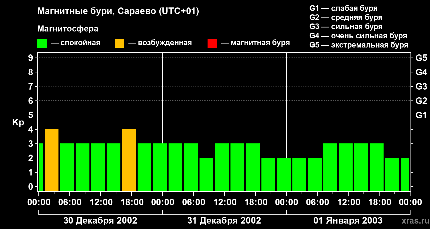 Изменения геомагнитного индекса Kp с 30 декабря 2002 года по 1 января 2003 года для средних широт