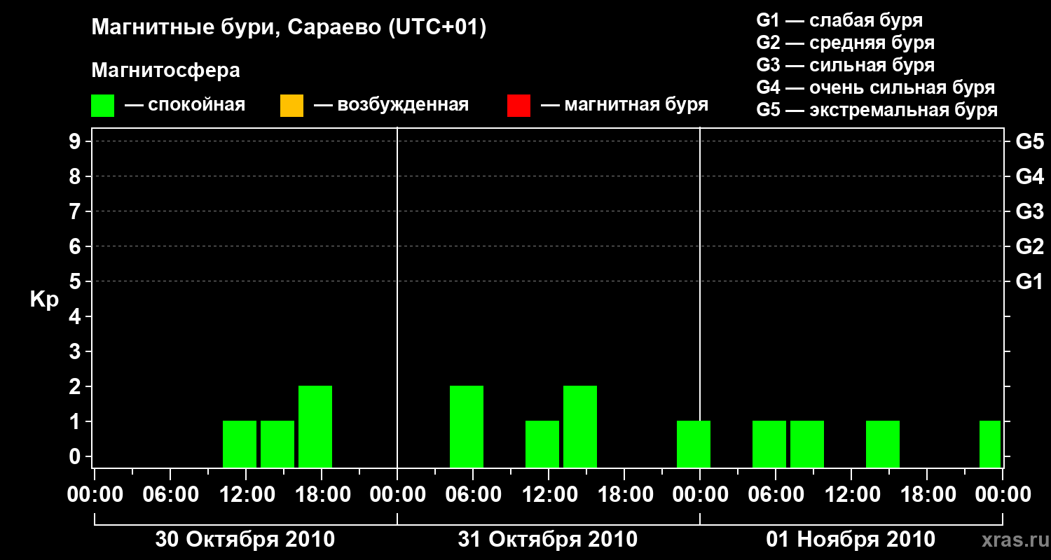 Изменения геомагнитного индекса Kp с 30 октября по 1 ноября 2010 года для средних широт