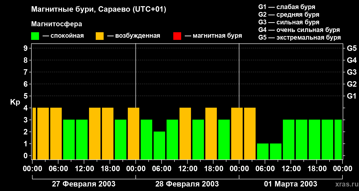 Изменения геомагнитного индекса Kp с 27 февраля по 1 марта 2003 года для средних широт