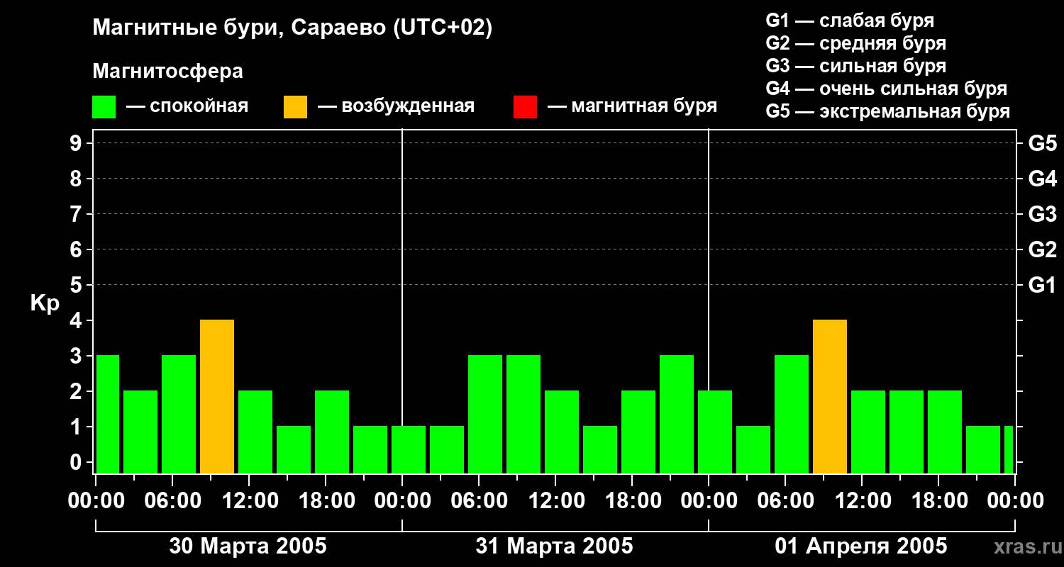 Изменения геомагнитного индекса Kp с 30 марта по 1 апреля 2005 года для средних широт