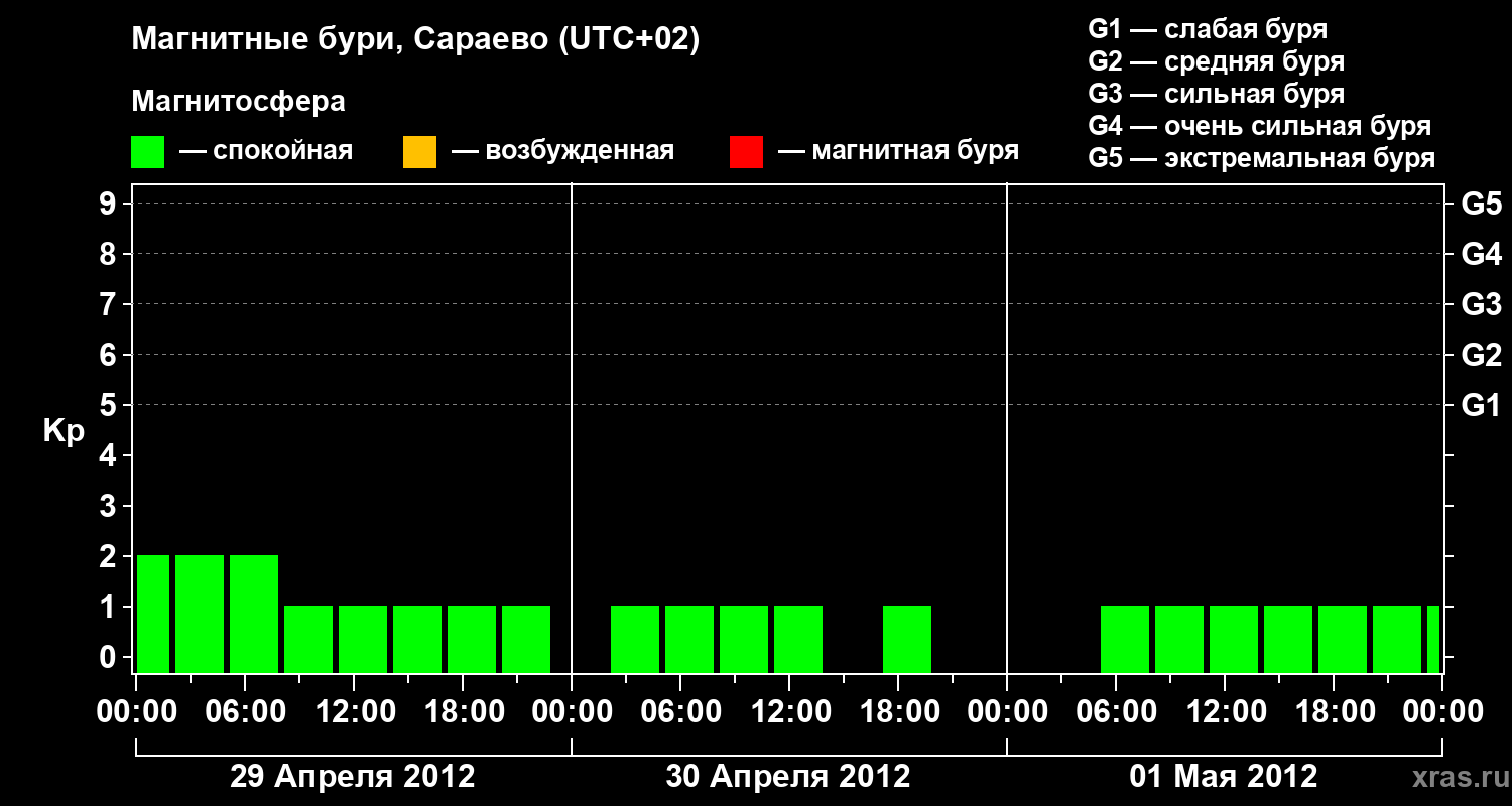 Изменения геомагнитного индекса Kp с 29 апреля по 1 мая 2012 года для средних широт