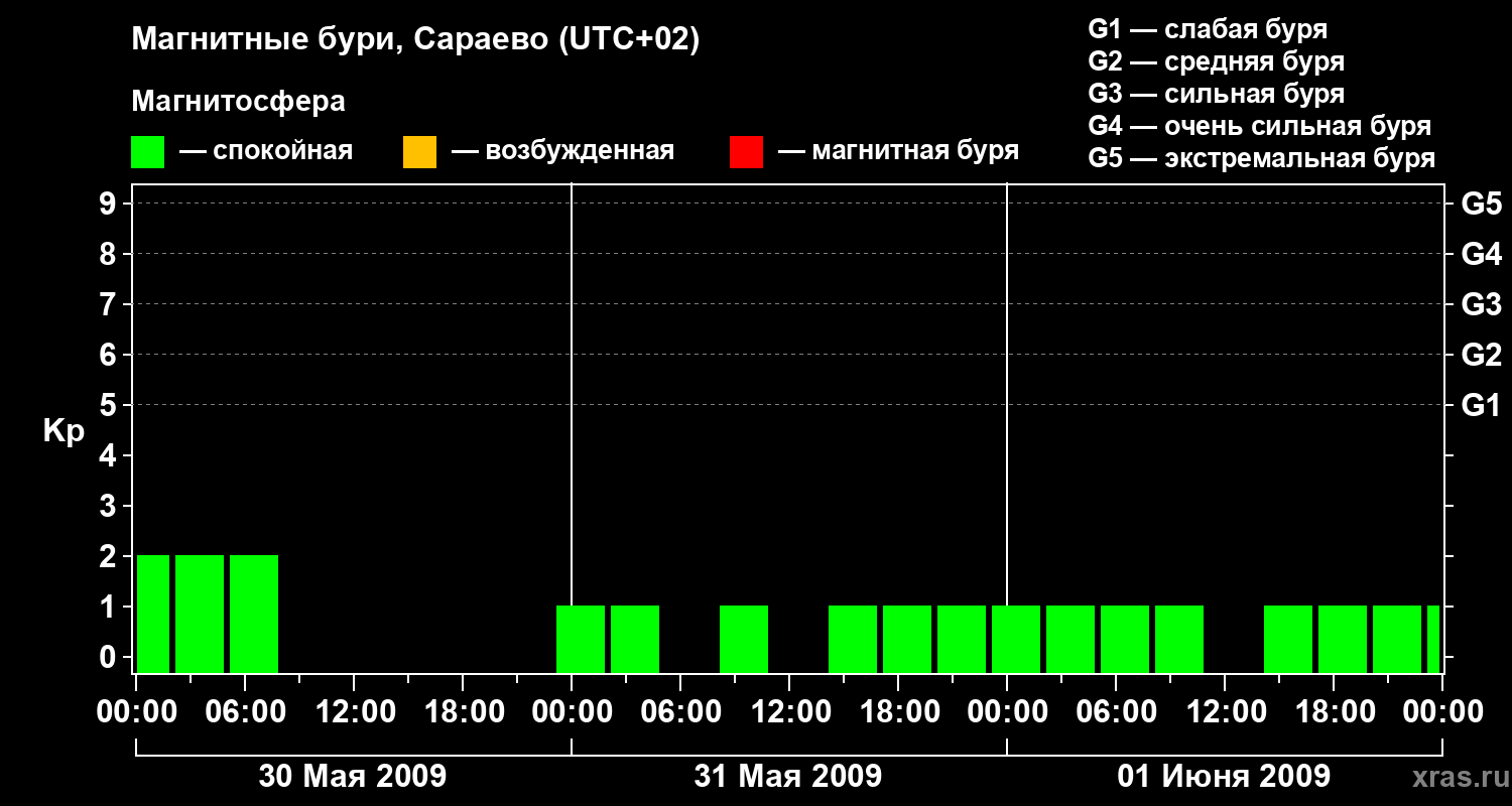 Изменения геомагнитного индекса Kp с 30 мая по 1 июня 2009 года для средних широт