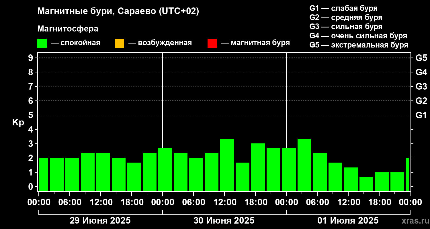 Изменения геомагнитного индекса Kp с 29 июня по 1 июля 2025 года для средних широт