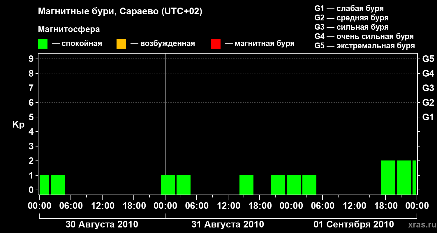 Изменения геомагнитного индекса Kp с 30 августа по 1 сентября 2010 года для средних широт