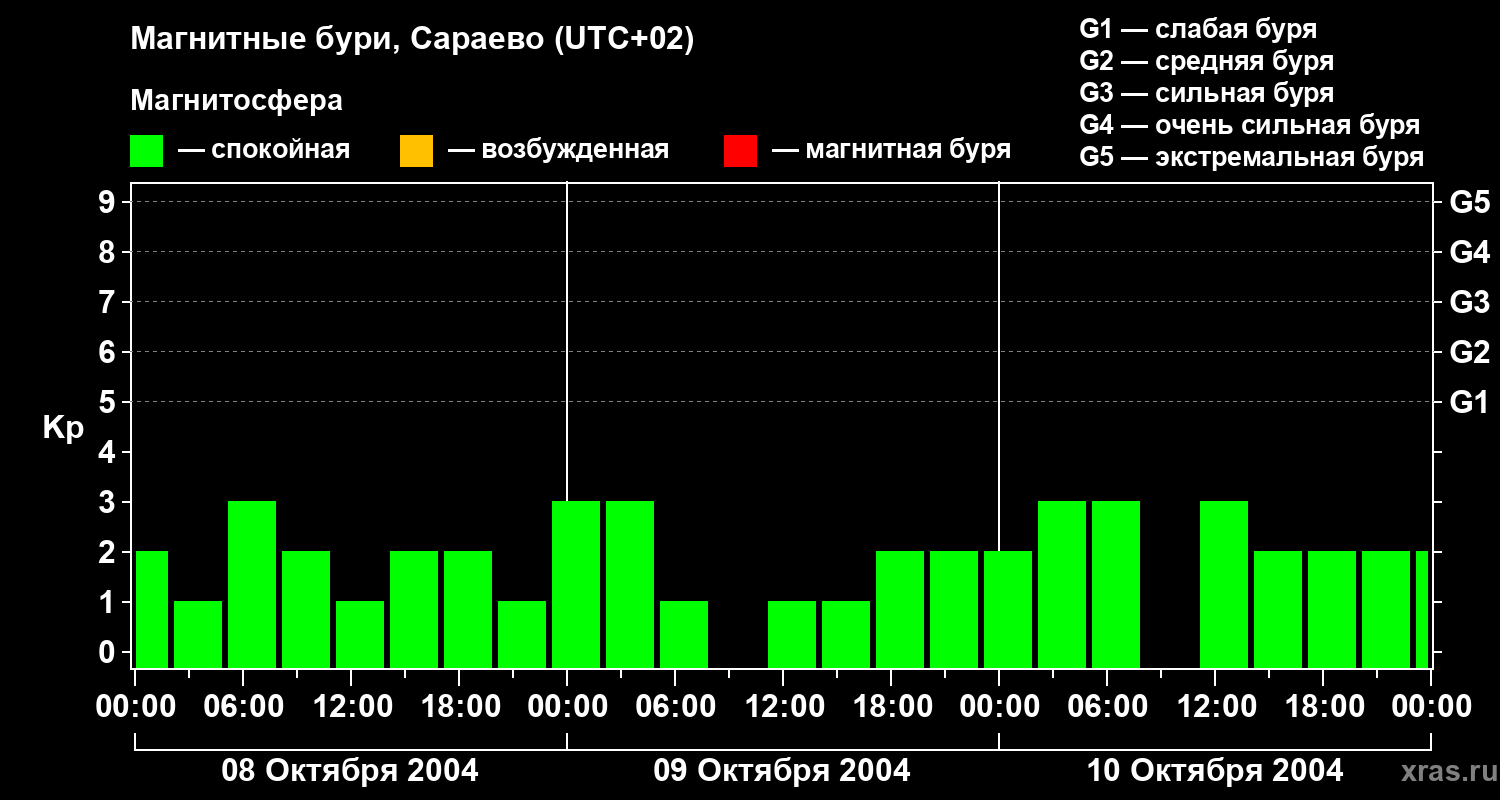 Изменения геомагнитного индекса Kp с 8 по 10 октября 2004 года для средних широт