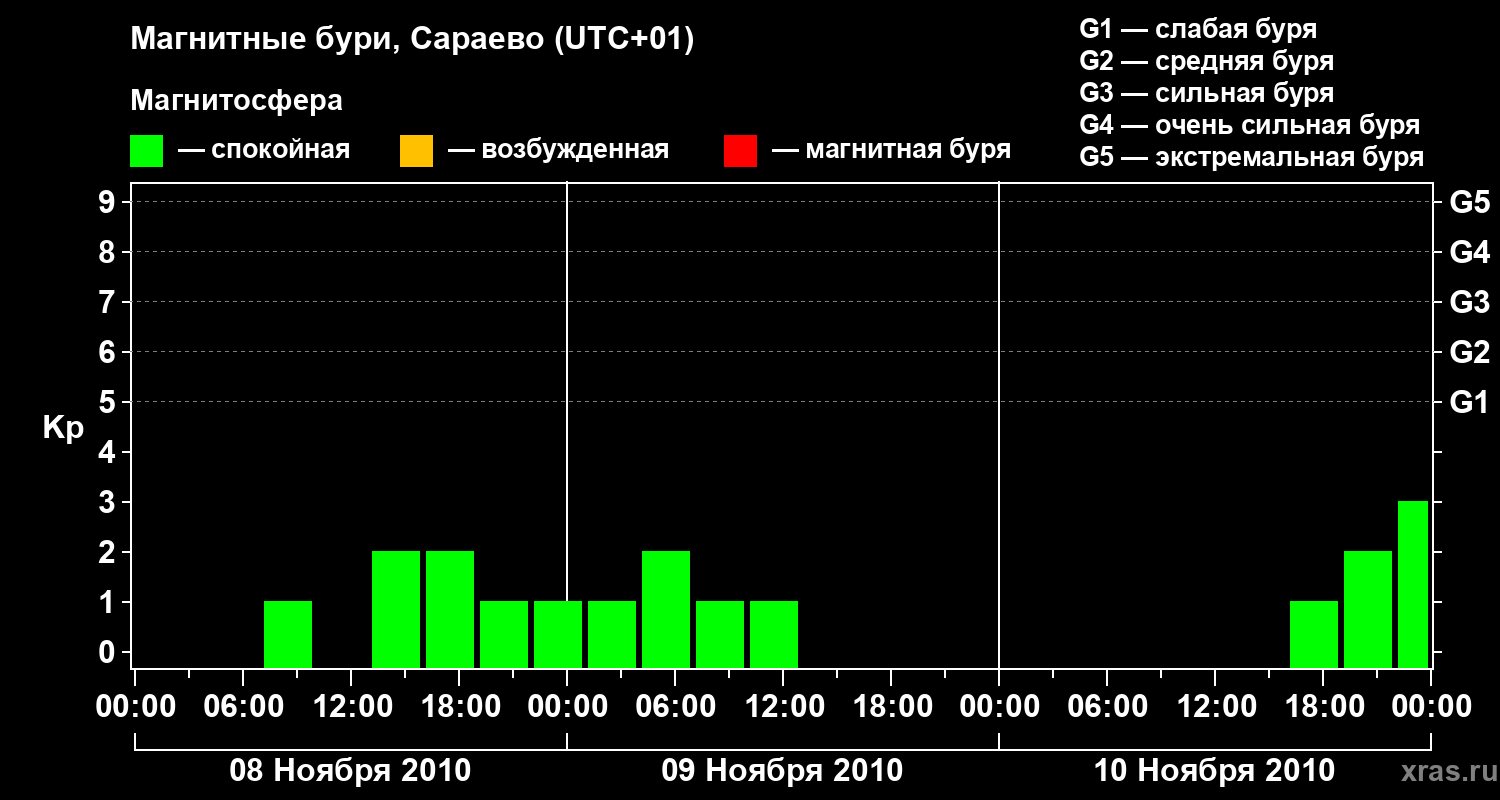 Изменения геомагнитного индекса Kp с 8 по 10 ноября 2010 года для средних широт