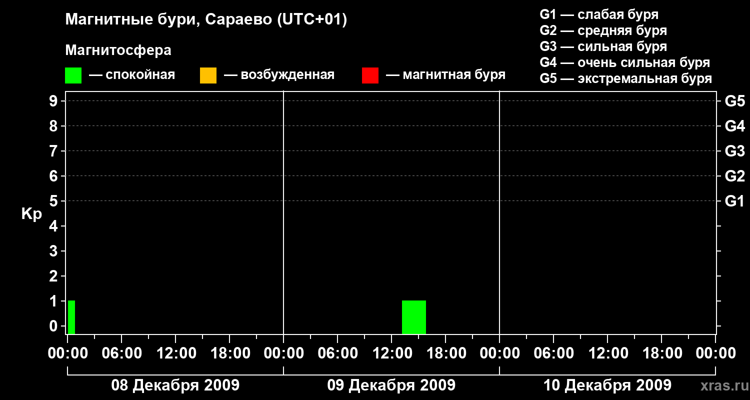 Изменения геомагнитного индекса Kp с 8 по 10 декабря 2009 года для средних широт