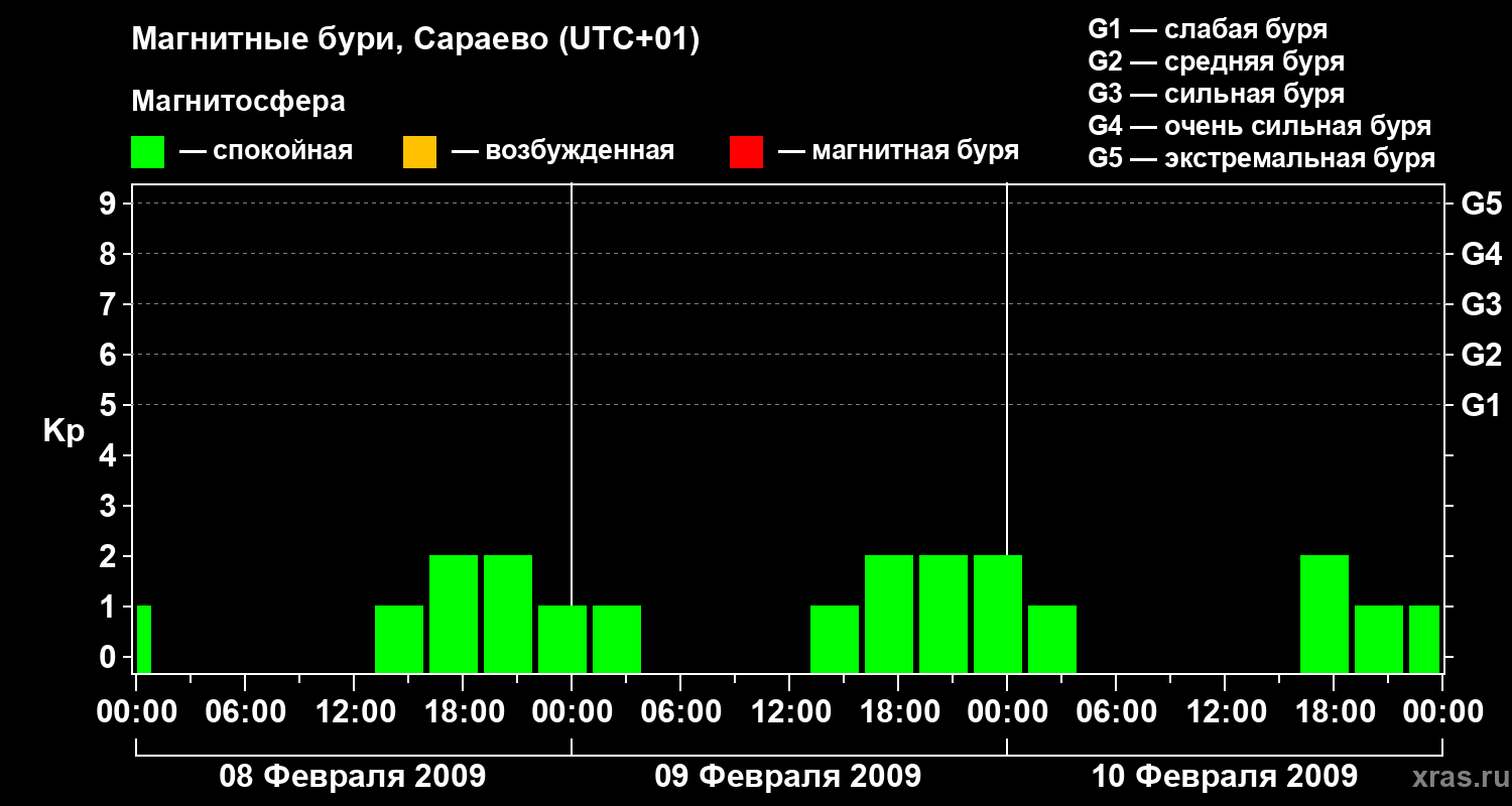 Изменения геомагнитного индекса Kp с 8 по 10 февраля 2009 года для средних широт