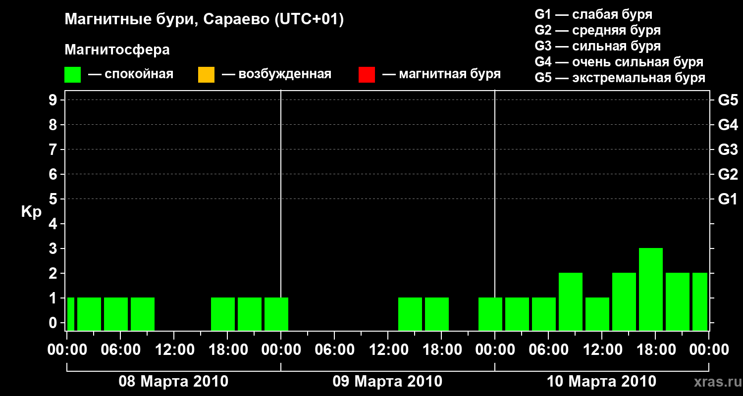 Изменения геомагнитного индекса Kp с 8 по 10 марта 2010 года для средних широт