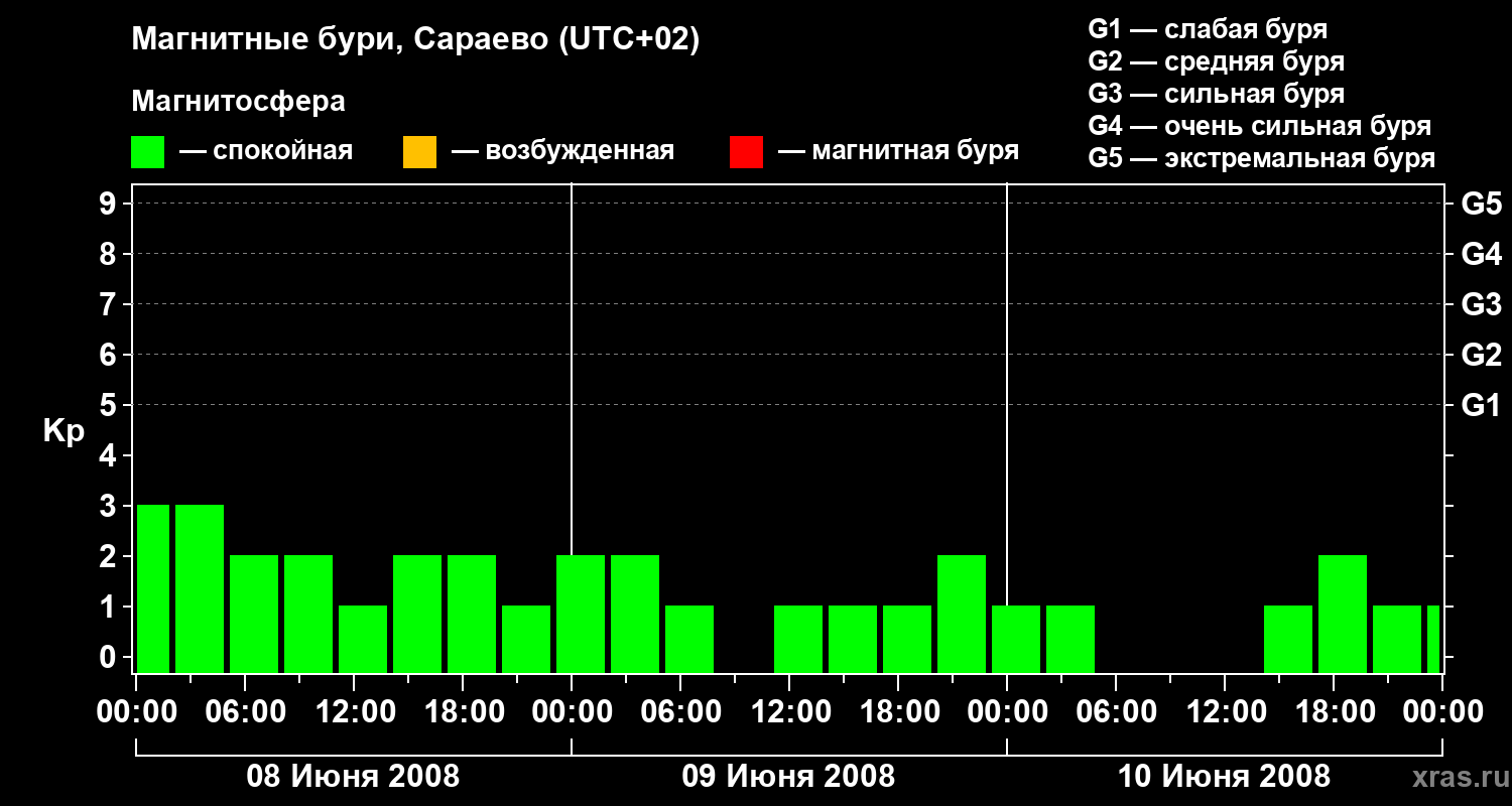 Изменения геомагнитного индекса Kp с 8 по 10 июня 2008 года для средних широт