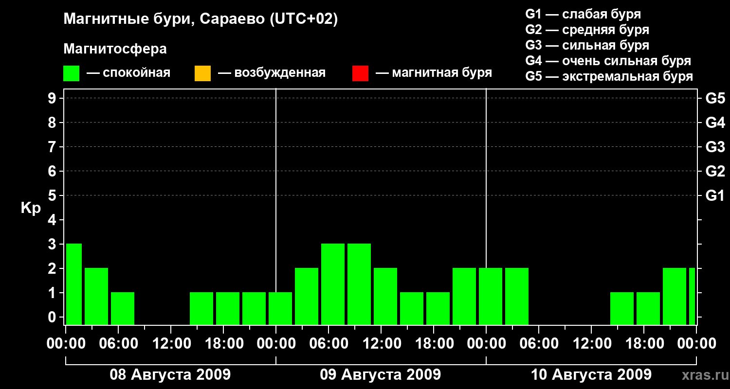 Изменения геомагнитного индекса Kp с 8 по 10 августа 2009 года для средних широт