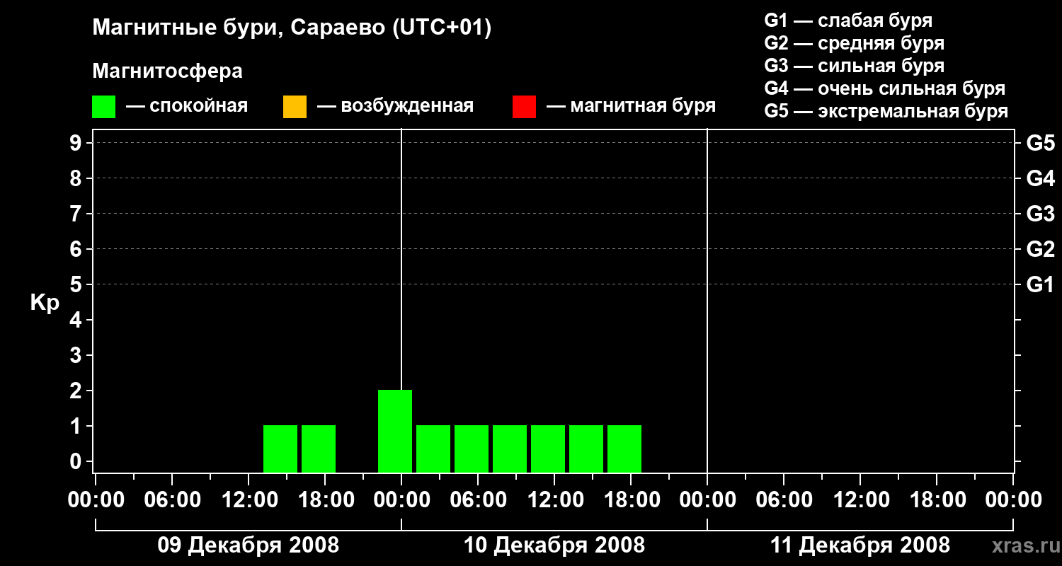 Изменения геомагнитного индекса Kp с 9 по 11 декабря 2008 года для средних широт