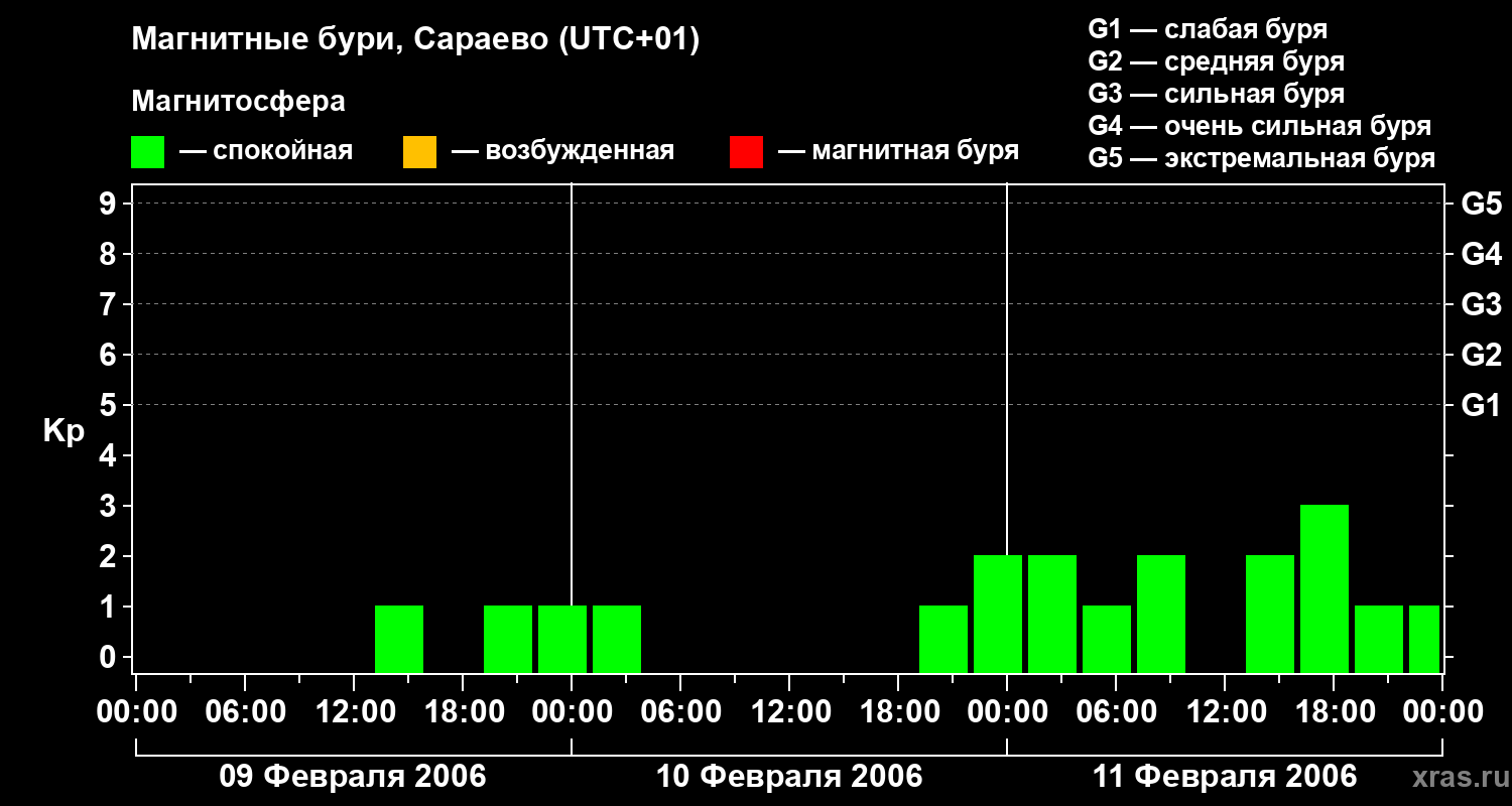 Изменения геомагнитного индекса Kp с 9 по 11 февраля 2006 года для средних широт