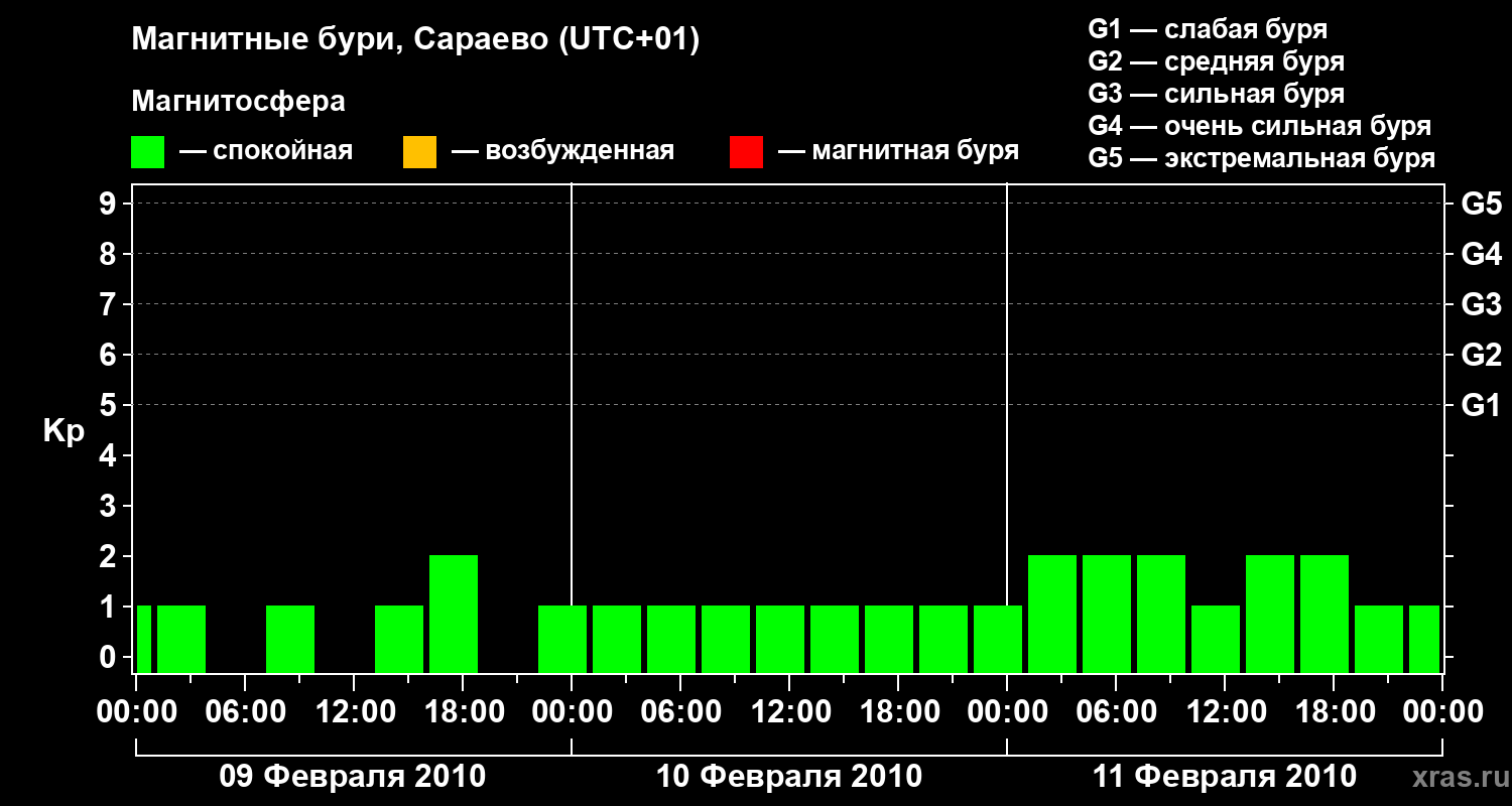Изменения геомагнитного индекса Kp с 9 по 11 февраля 2010 года для средних широт