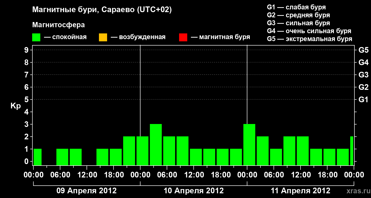 Изменения геомагнитного индекса Kp с 9 по 11 апреля 2012 года для средних широт