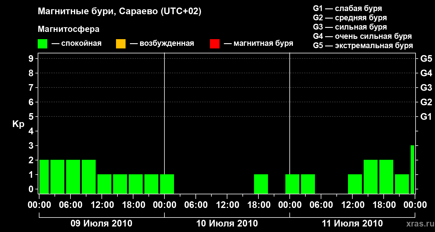 Изменения геомагнитного индекса Kp с 9 по 11 июля 2010 года для средних широт