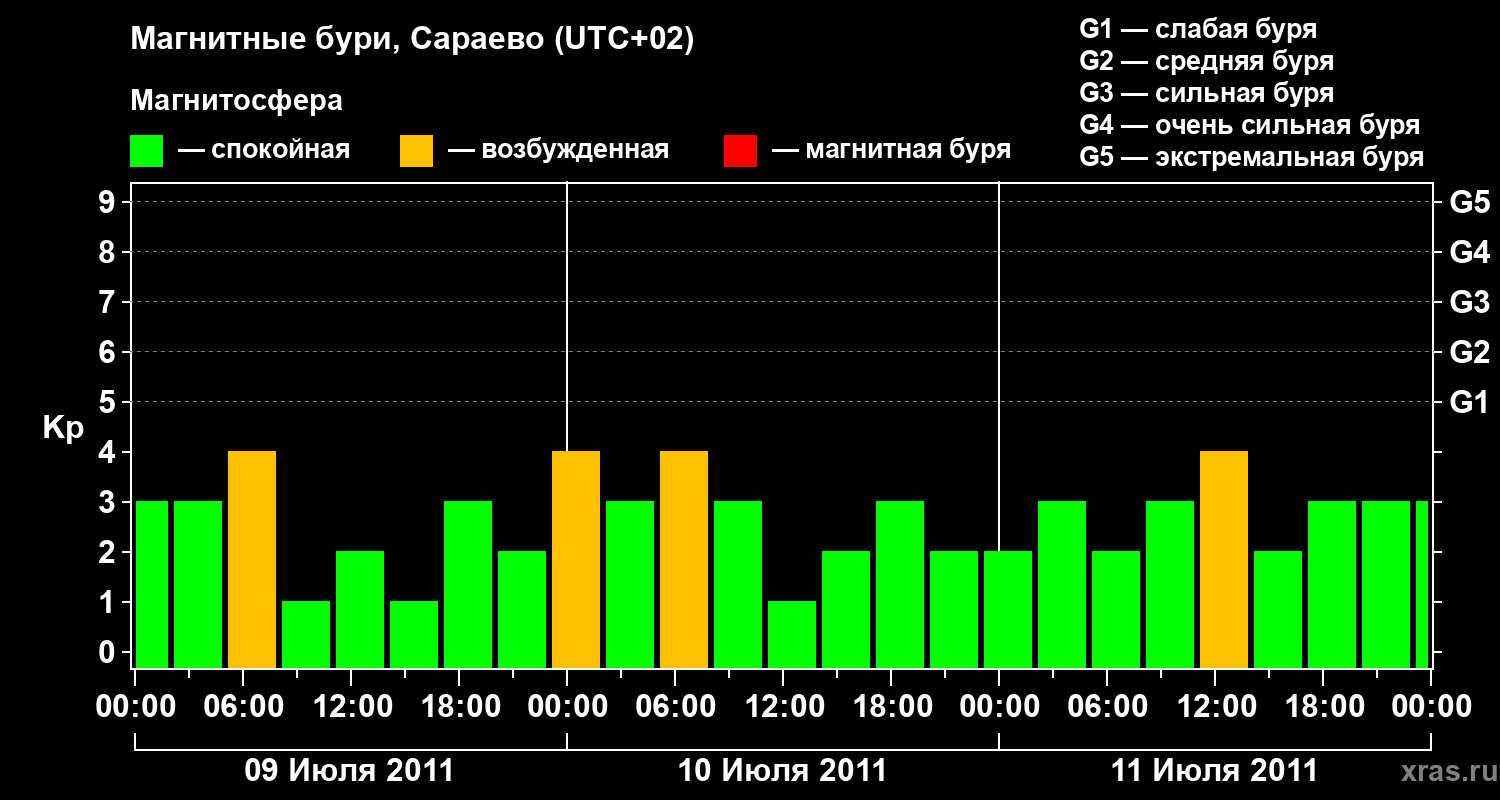 Изменения геомагнитного индекса Kp с 9 по 11 июля 2011 года для средних широт