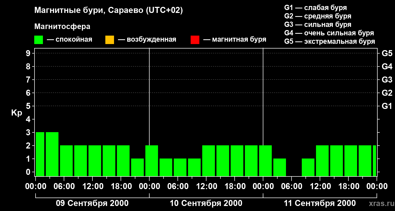 Изменения геомагнитного индекса Kp с 9 по 11 сентября 2000 года для средних широт