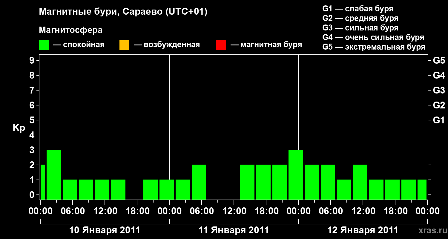 Изменения геомагнитного индекса Kp с 10 по 12 января 2011 года для средних широт