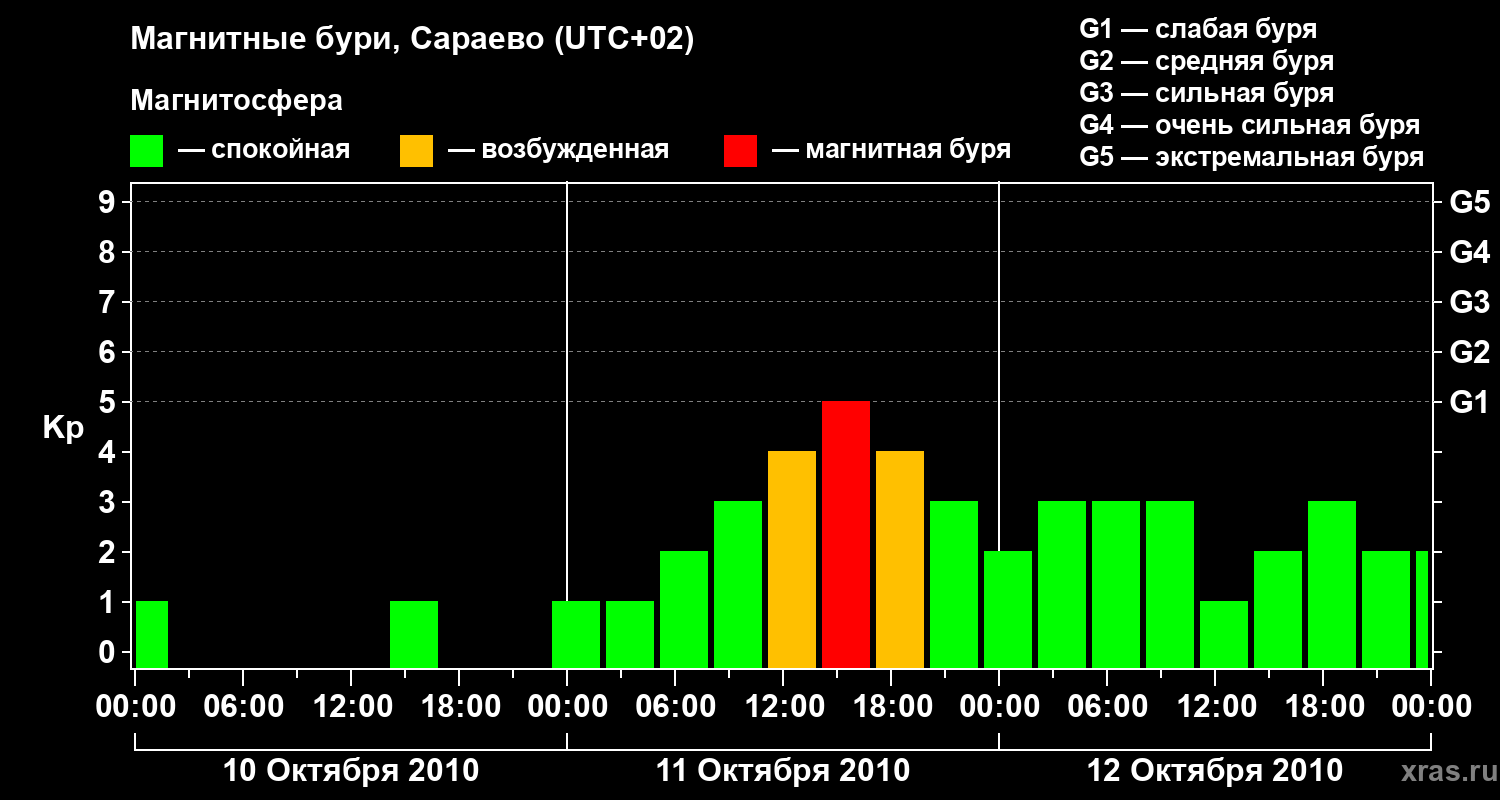 Изменения геомагнитного индекса Kp с 10 по 12 октября 2010 года для средних широт