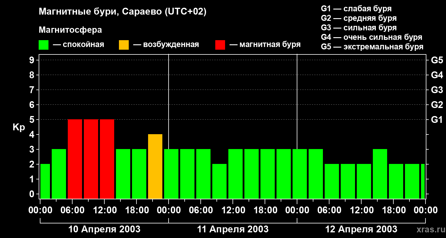 Изменения геомагнитного индекса Kp с 10 по 12 апреля 2003 года для средних широт
