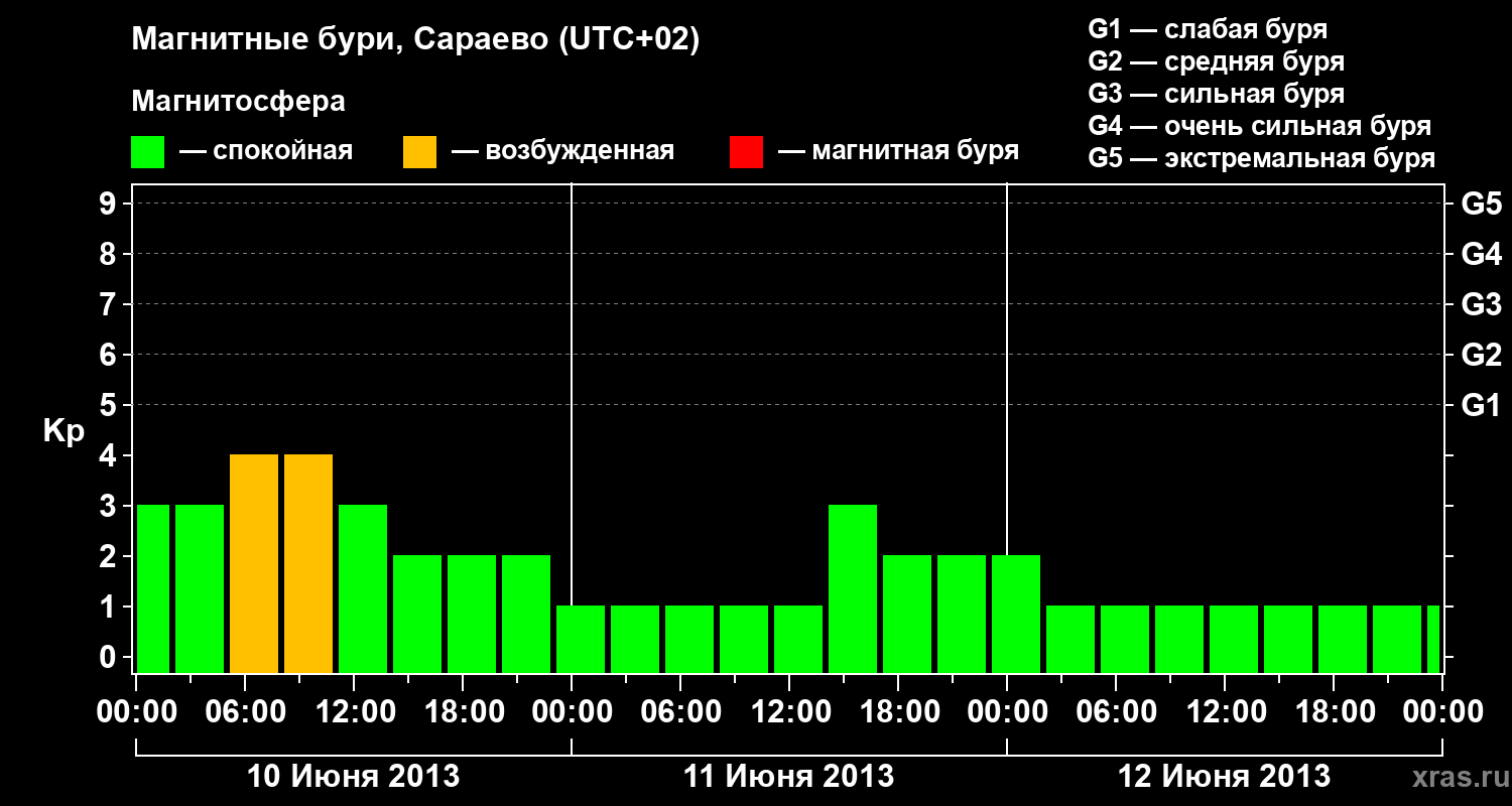 Изменения геомагнитного индекса Kp с 10 по 12 июня 2013 года для средних широт