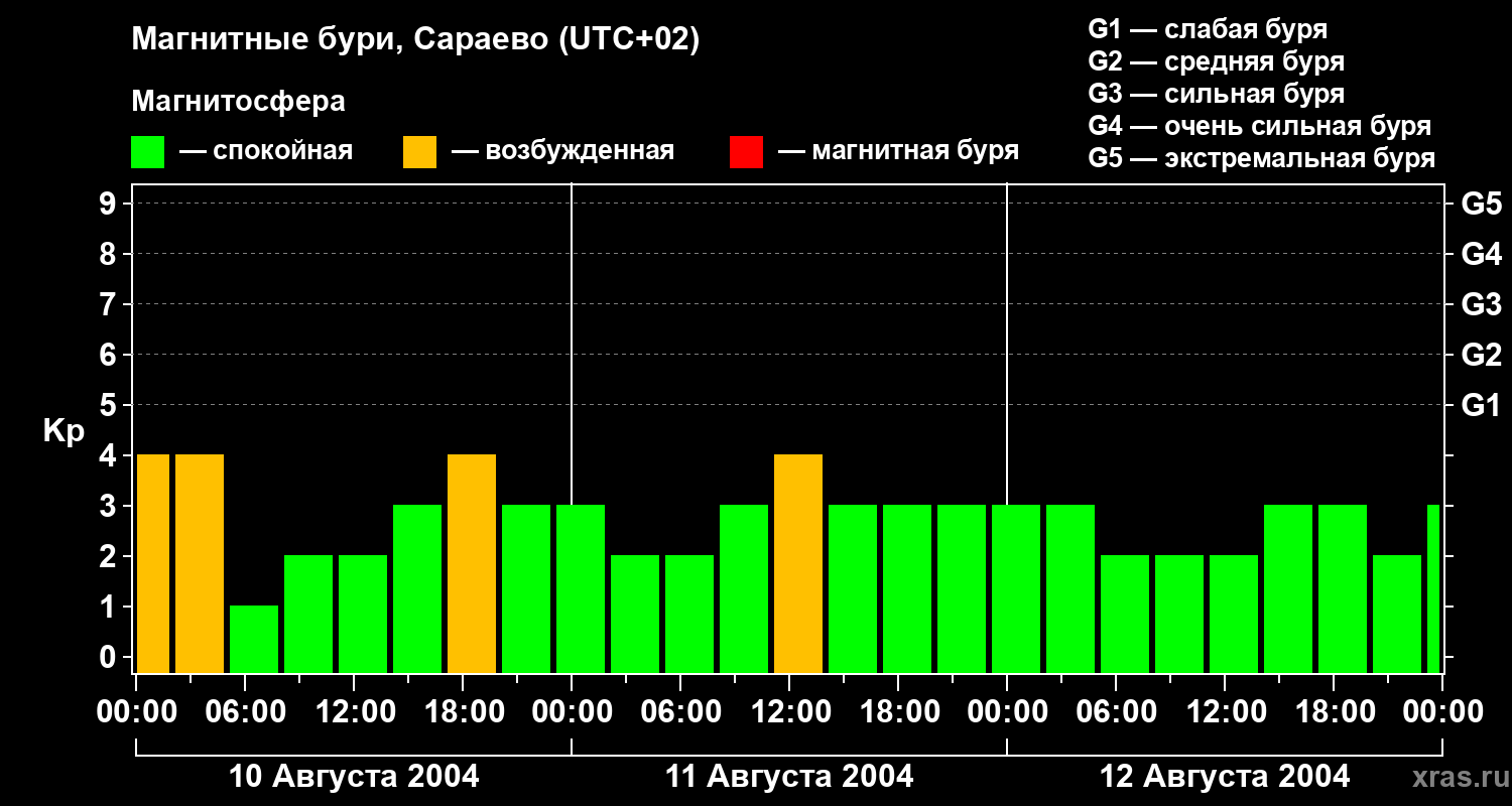 Изменения геомагнитного индекса Kp с 10 по 12 августа 2004 года для средних широт