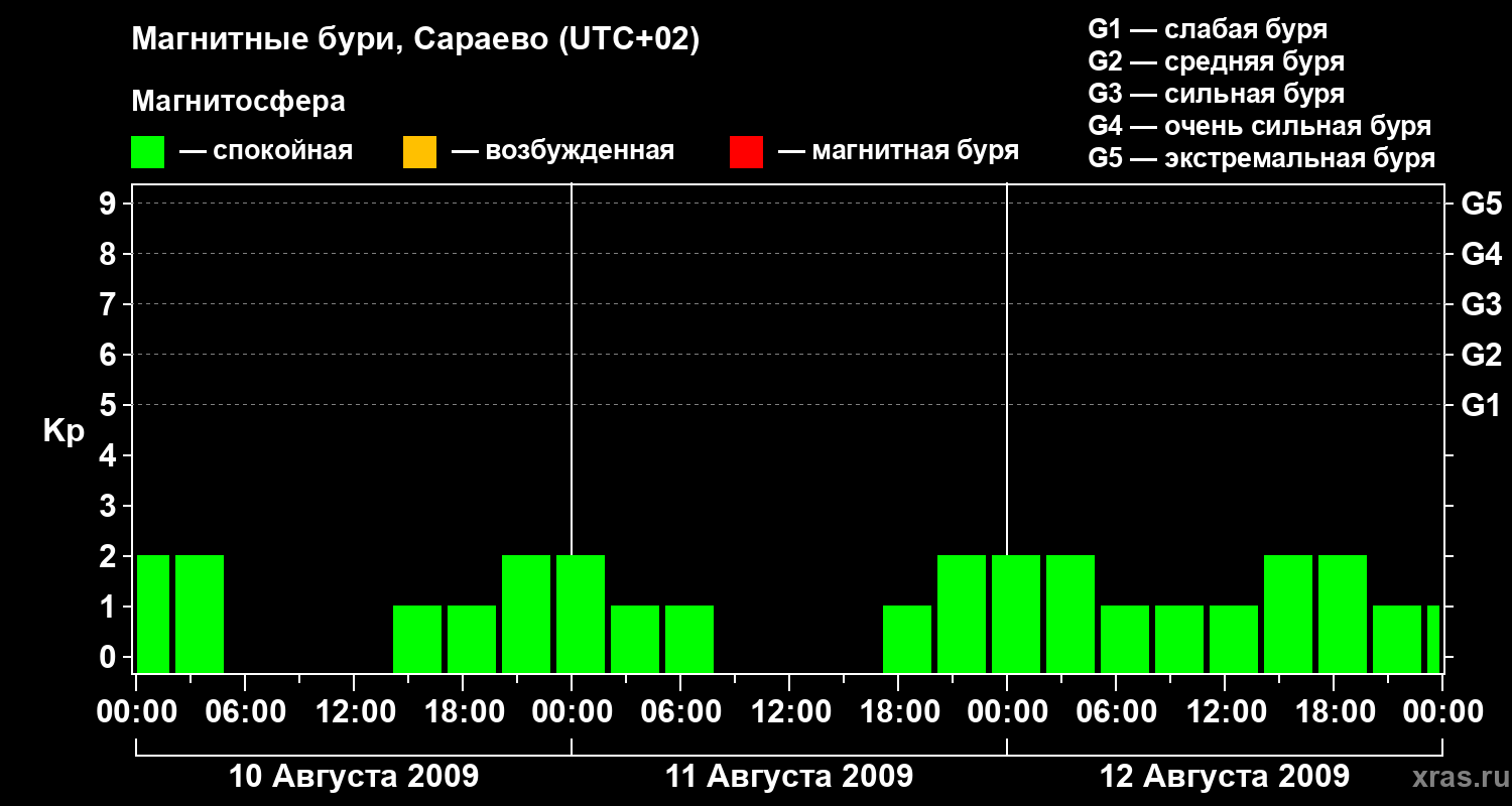 Изменения геомагнитного индекса Kp с 10 по 12 августа 2009 года для средних широт