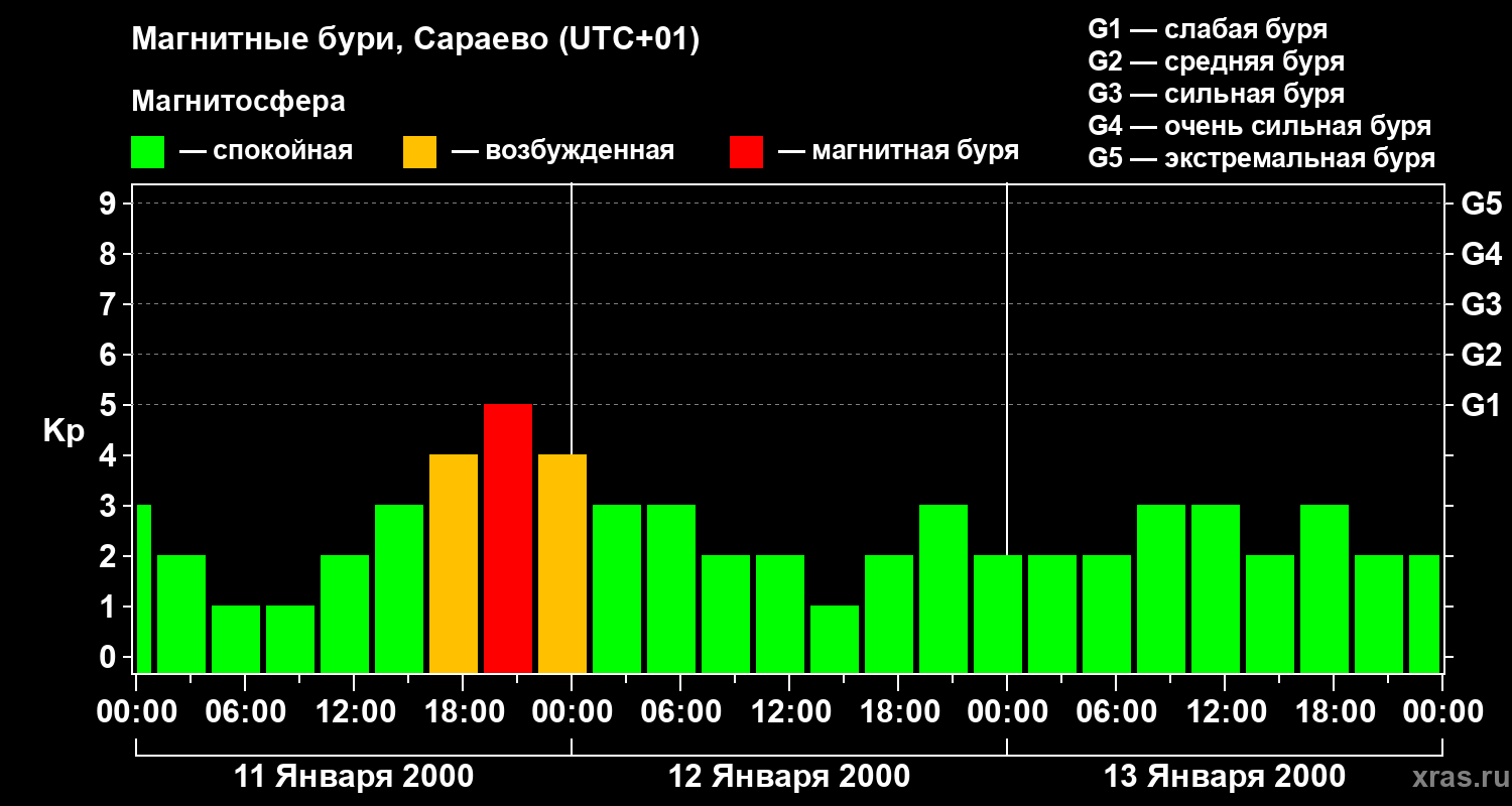 Изменения геомагнитного индекса Kp с 11 по 13 января 2000 года для средних широт