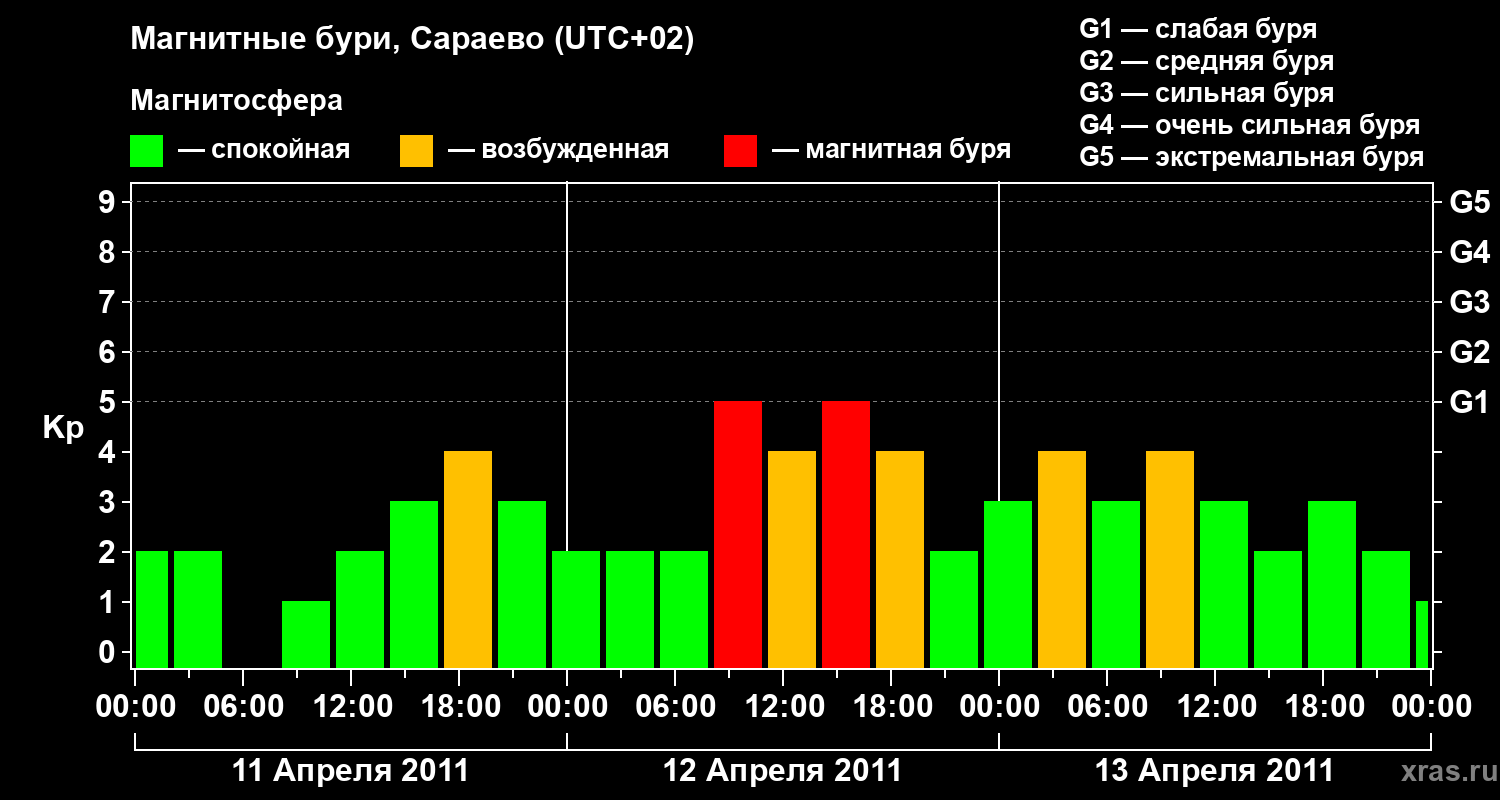 Изменения геомагнитного индекса Kp с 11 по 13 апреля 2011 года для средних широт