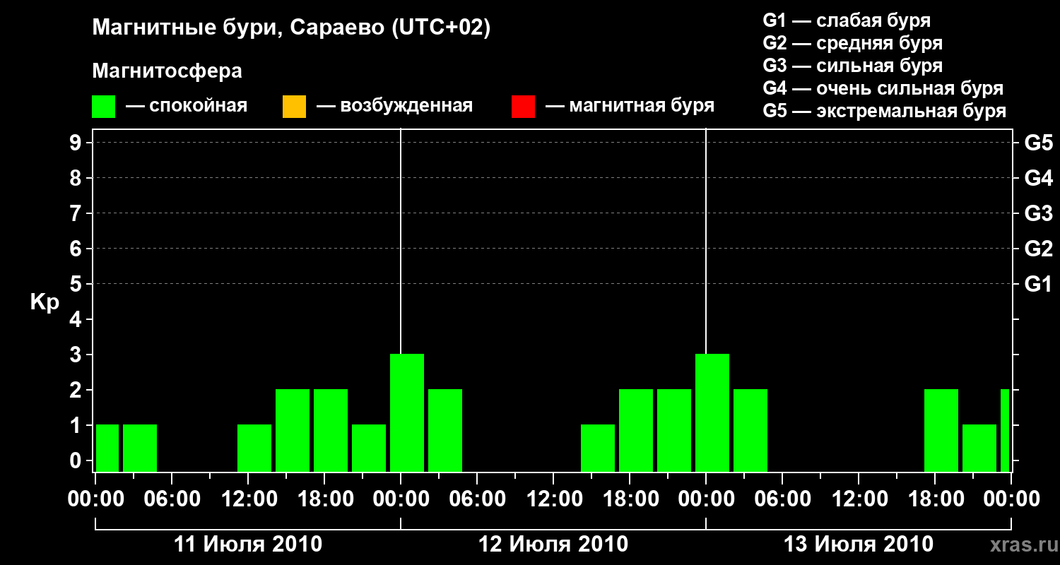 Изменения геомагнитного индекса Kp с 11 по 13 июля 2010 года для средних широт