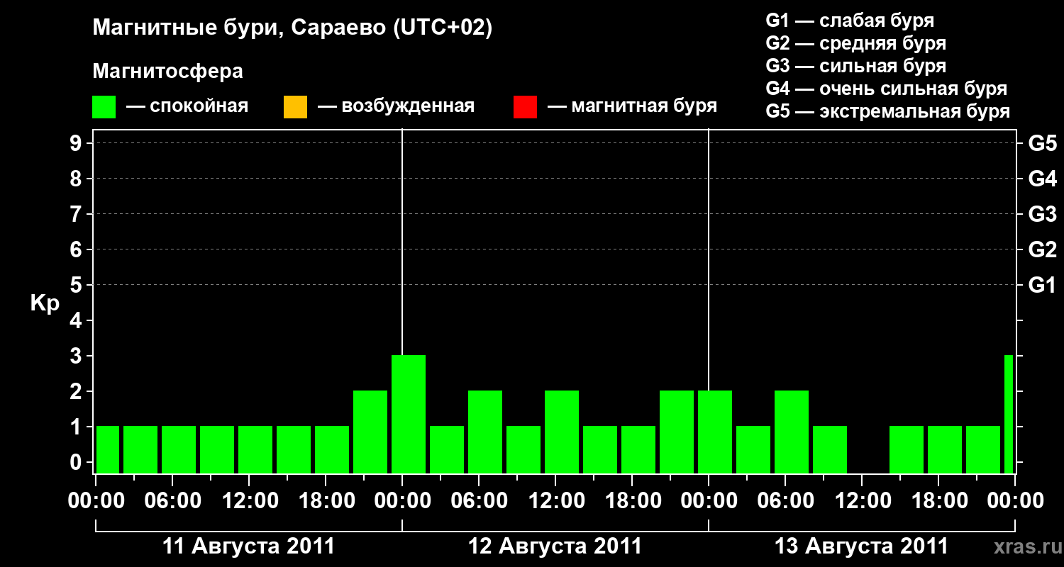 Изменения геомагнитного индекса Kp с 11 по 13 августа 2011 года для средних широт