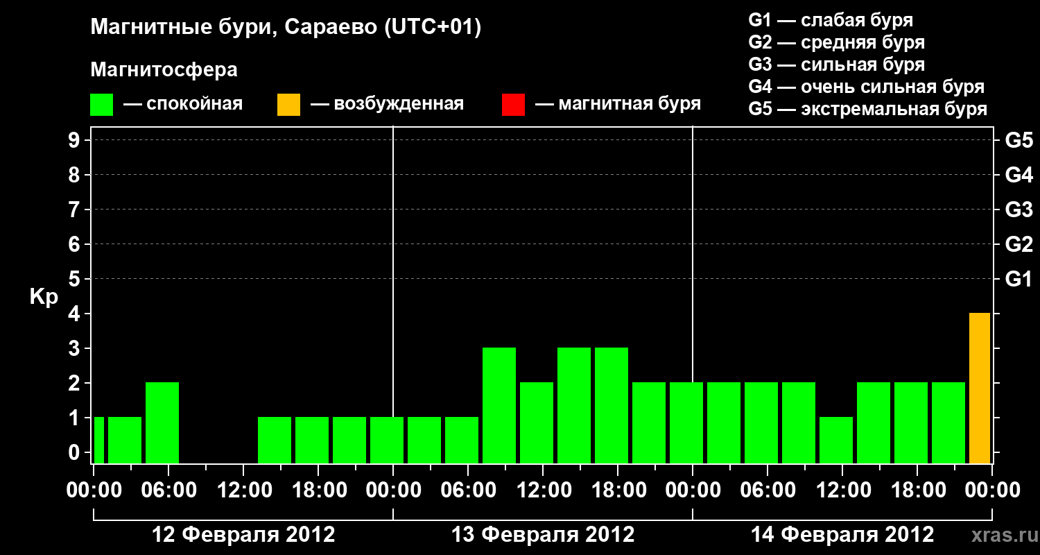 Изменения геомагнитного индекса Kp с 12 по 14 февраля 2012 года для средних широт