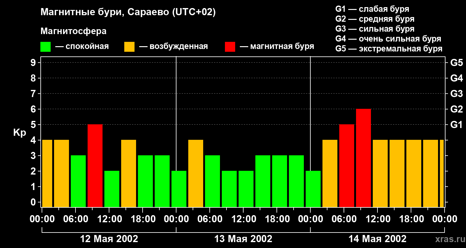 Изменения геомагнитного индекса Kp с 12 по 14 мая 2002 года для средних широт