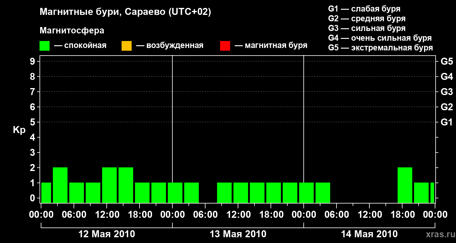 Изменения геомагнитного индекса Kp с 12 по 14 мая 2010 года для средних широт